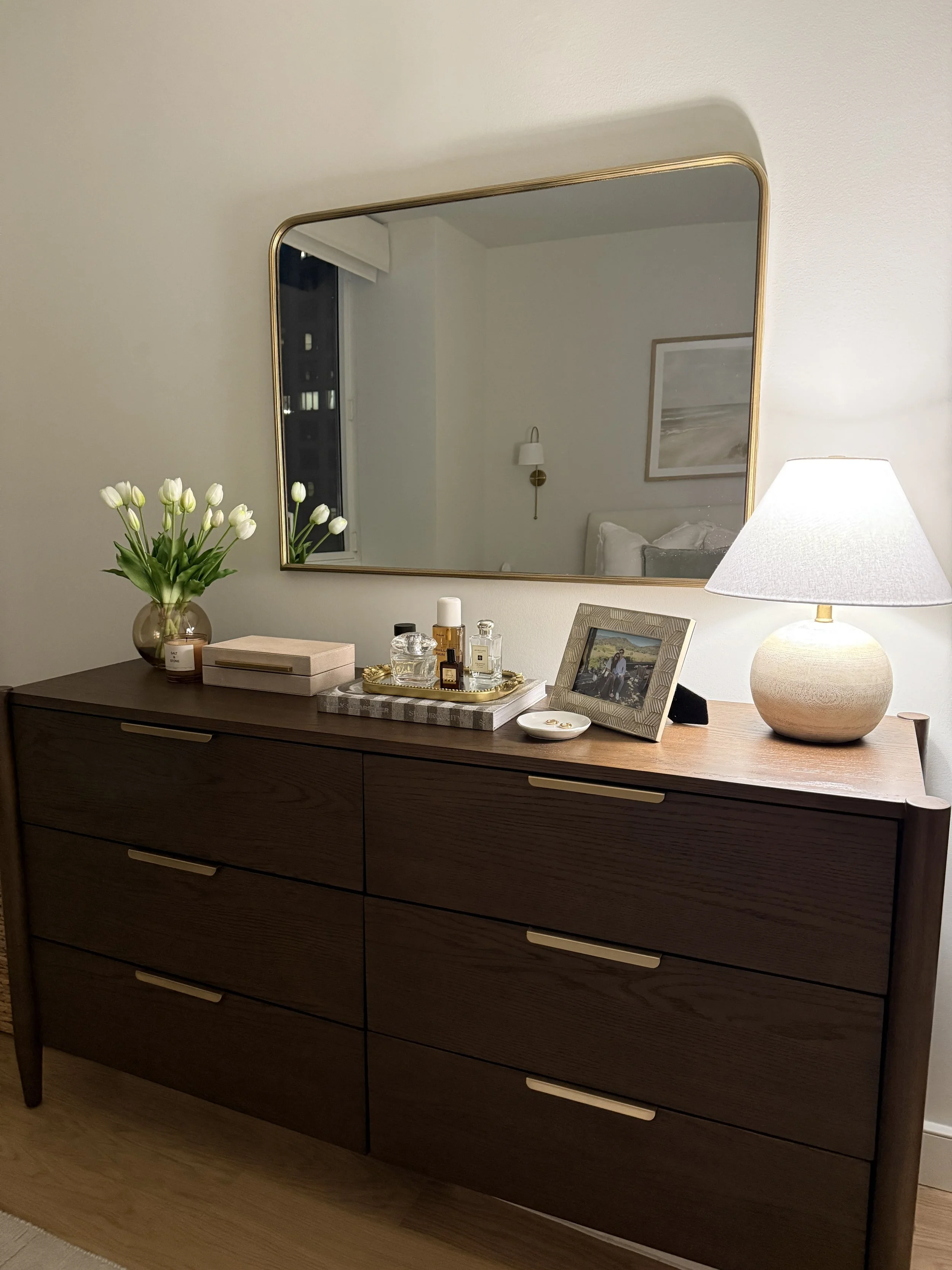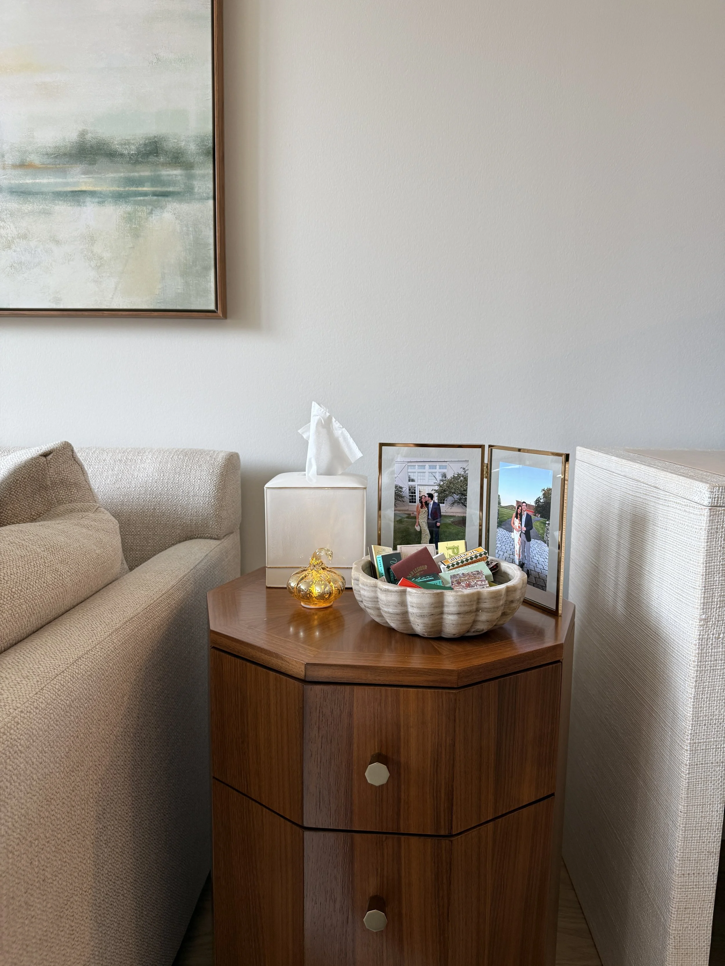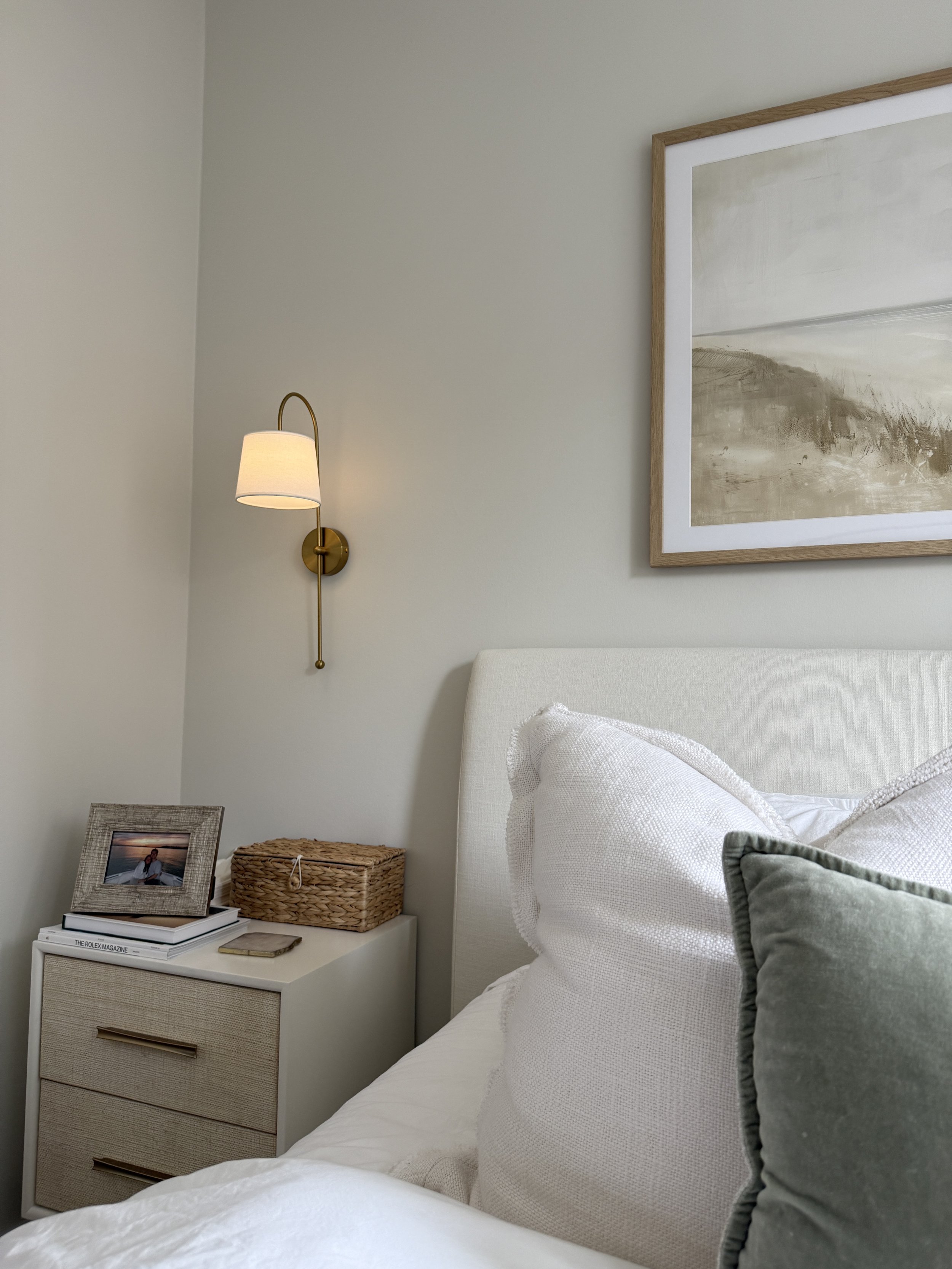 For the bedroom, the goal was to carry that same sense of calm throughout the apartment by using a consistent color palette. We incorporated their love of the beach through artwork and kept the bed light and airy, balancing it with deeper wood tones and subtle touches of brass. The result is a space that feels clean, elevated, and soothing—neutral, but far from bland.