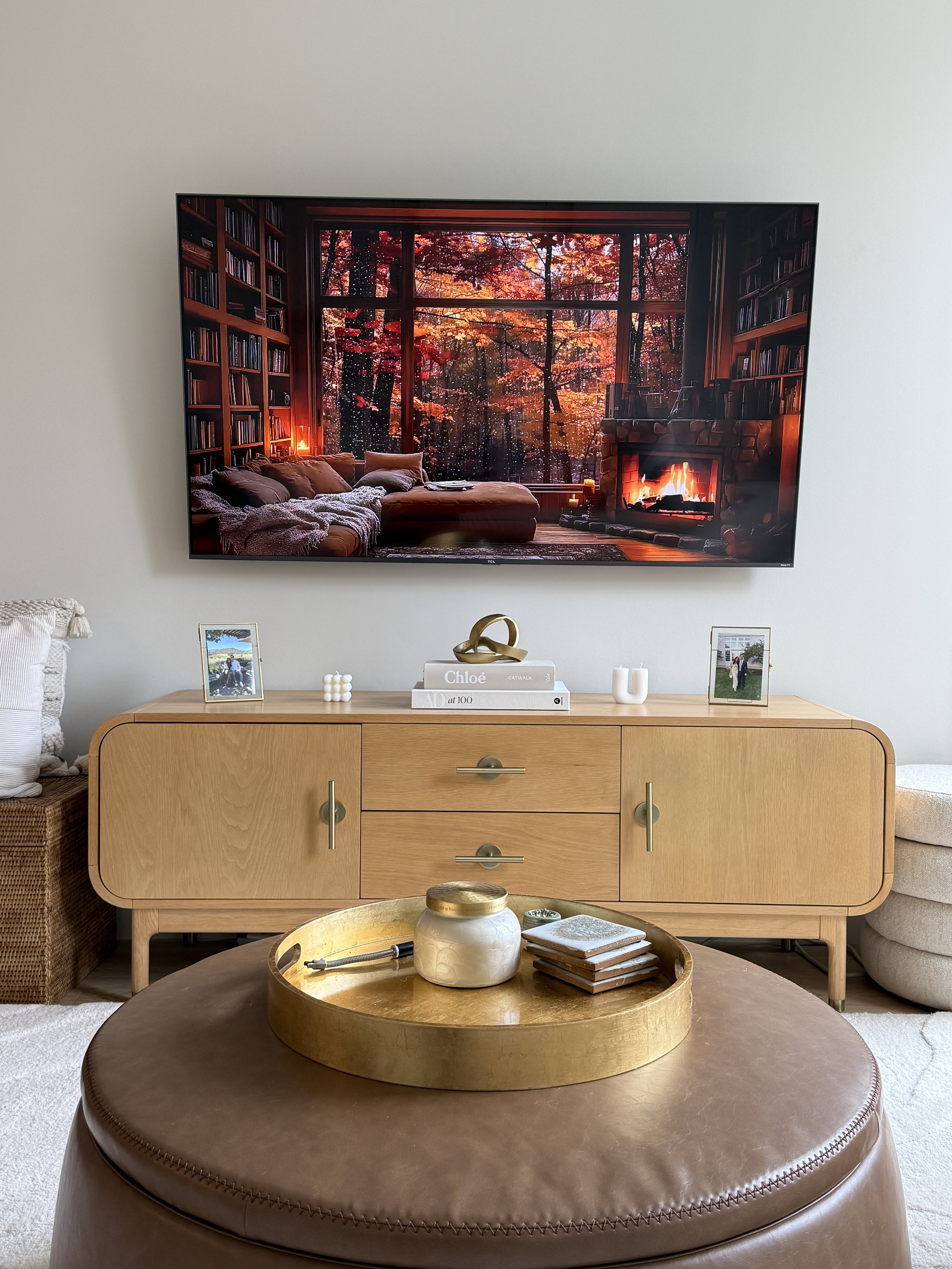 This client had a very distinct, almost mid-century modern style that challenged me to step outside my usual aesthetic. They wanted to rework their existing layout to create a more functional and cohesive space for TV watching. Ultimately, we decided to divide the room into two zones — a comfortable living area and a cozy reading nook featuring a chair they wanted to repurpose. The client had a few specific requests, including keeping their orange ceiling, so I recommended slightly darkening the shade and incorporating the color throughout the room with complementary accents like throw pillows, lamps, and artwork.